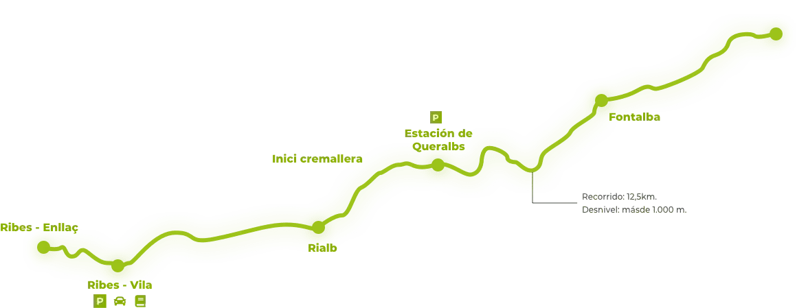 Le Cremallera de Núria part de Ribes de Freser et monte jusqu'au sanctuaire, franchissant un dénivelé important avec des vues spectaculaires.
